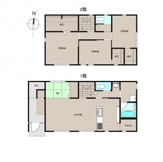 | 設備 | 側溝、システムキッチン、カウンターキッチン、食器洗浄乾燥機、IHクッキングヒーター、オール電化、シャンプードレッサー、洗浄便座、浴室乾燥機、複層ガラス、ウォークインクローゼット、モニタ付インターホン、駐車場2台分、床下収納、エコキュート、トイレ2箇所 | ||